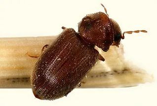 Эти жуки нередко заводятся в деревянных домах, представляя серьезную опасность. Эти черно-коричневые жучки размером не более 1 см прогрызают в древесине множество ходов, разрушая изделие.
